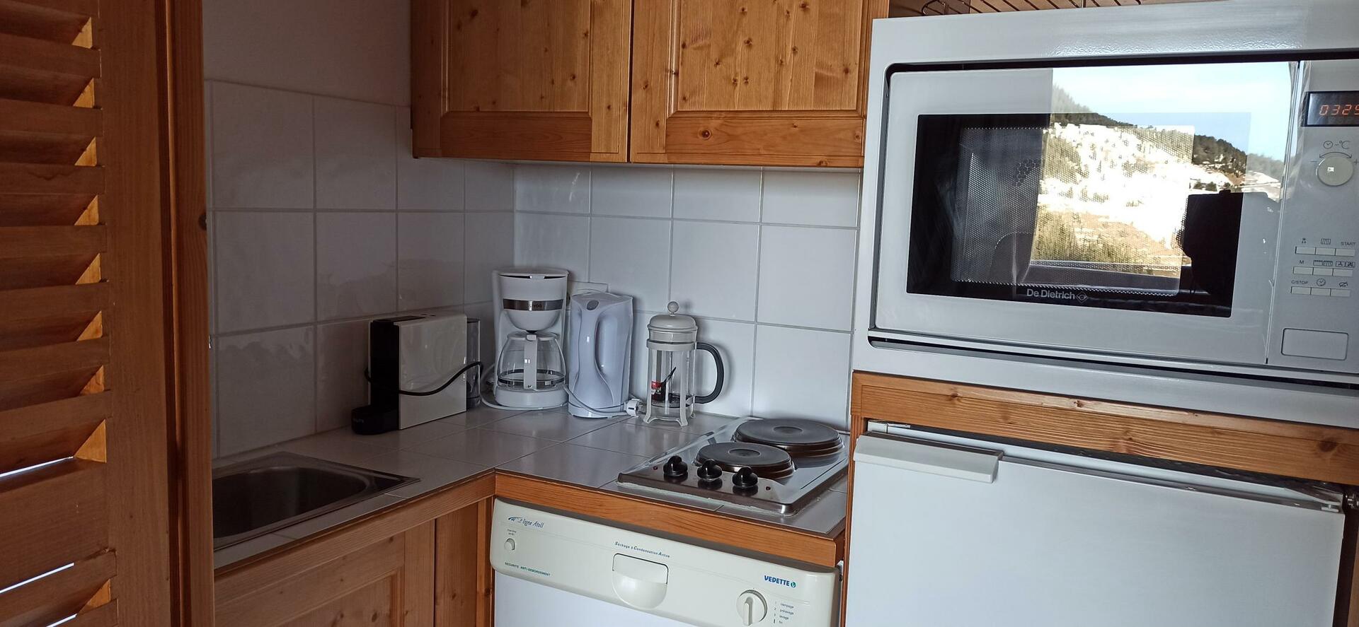 Kitchenette séparée du séjour par porte en bois: 2 plaques électriques, lave-vaisselle, réfrigérateur-freezer, four micro-ondes multifonctions, cafetière filtre, à piston et type Nespresso, appareil à raclette, cocotte-minute