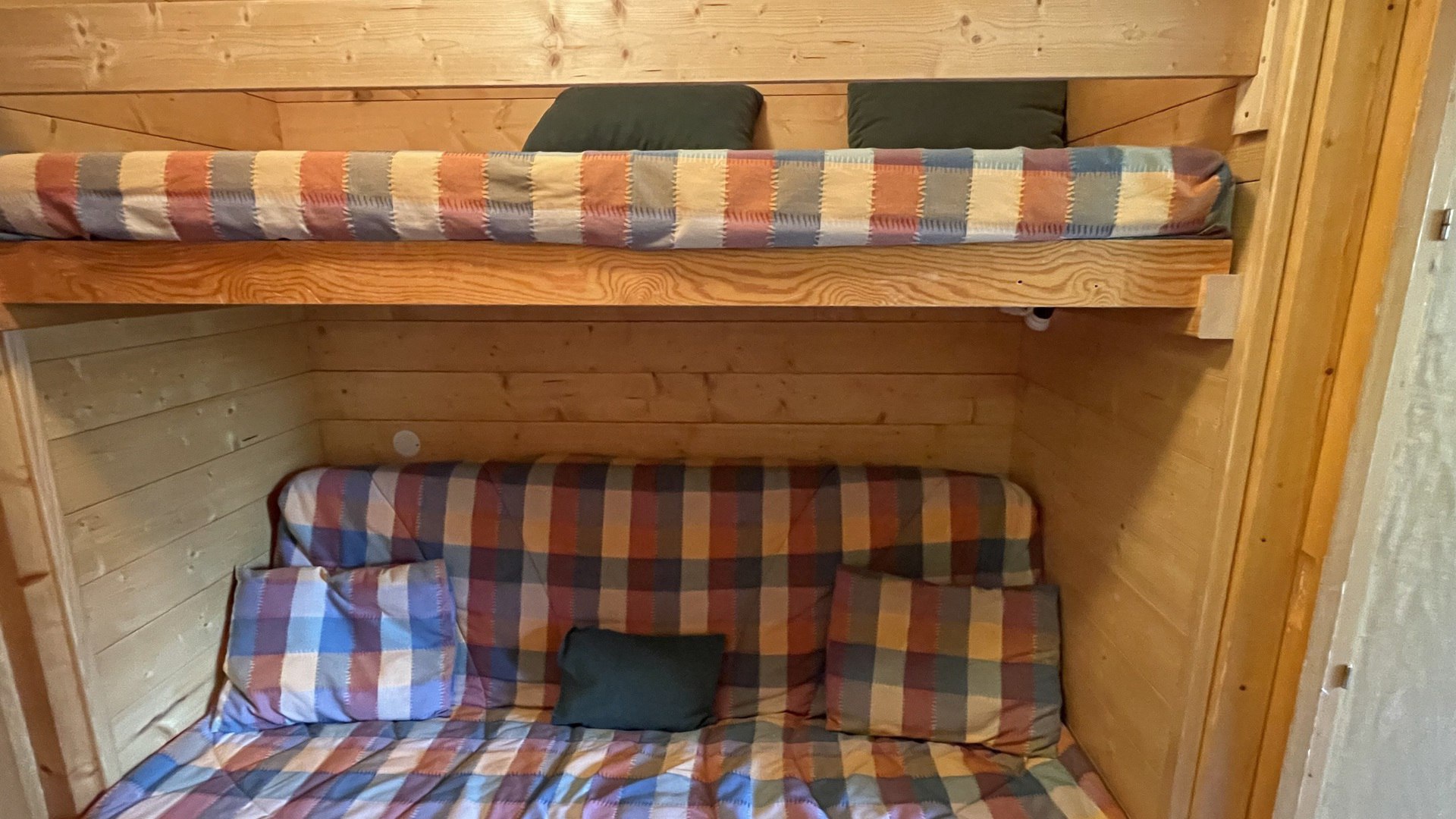 Un coin montagne à l'entrée de l'appartement avec 1 lit simple en hauteur et 1 banquette clic-clac dessous.