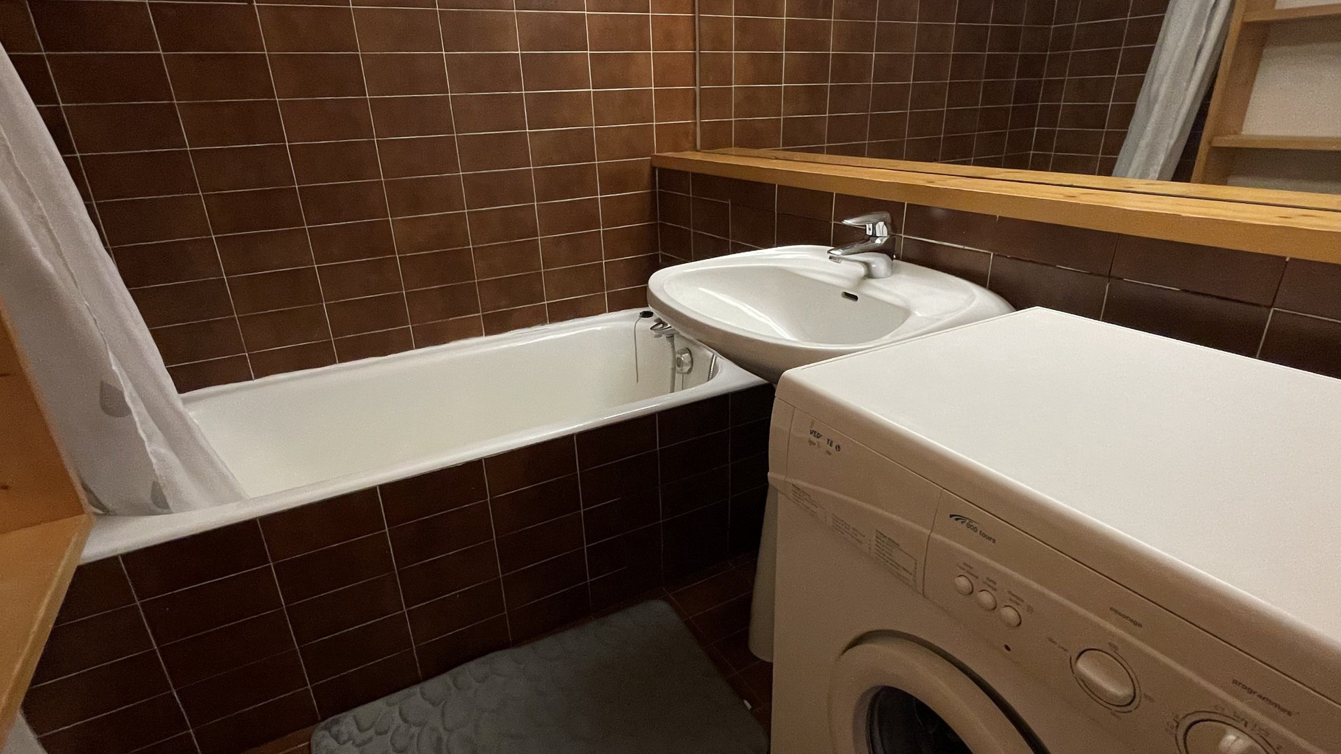 Une salle de bains avec baignoire et lave linge, et un WC séparé.